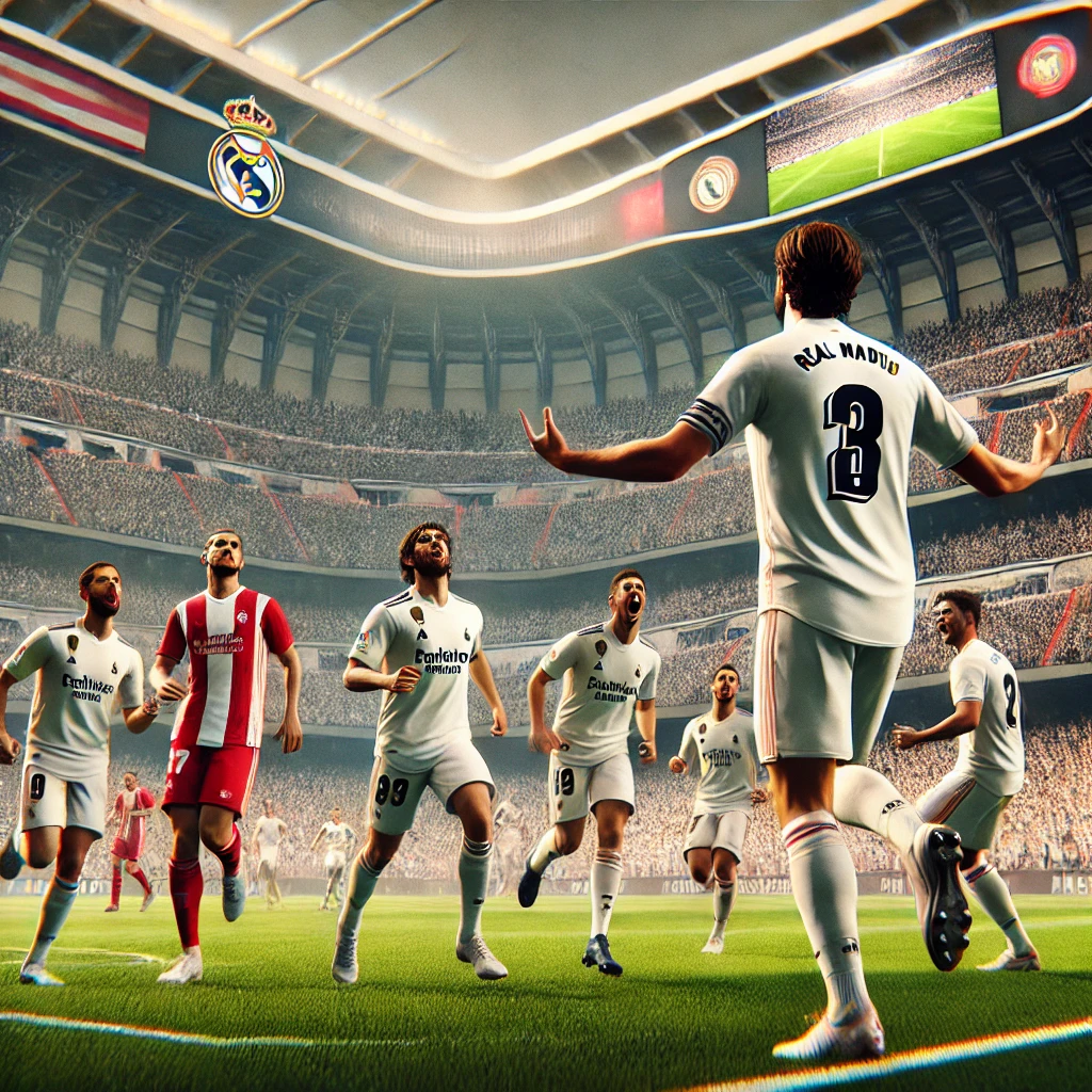 "Jogadores do Real Madrid comemoram a vitória sobre o Rayo Vallecano por 2x1. Vinícius Júnior e Kylian Mbappé marcaram os gols que garantiram o triunfo dos merengues. O estádio lotado reflete a intensidade do confronto entre Real Madrid x Rayo Vallecano."